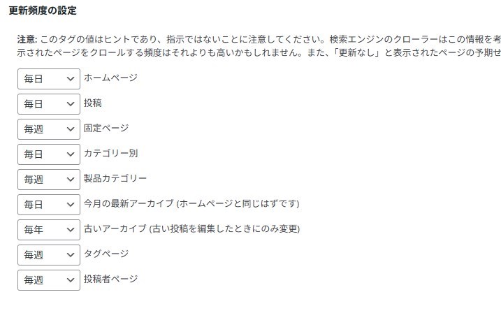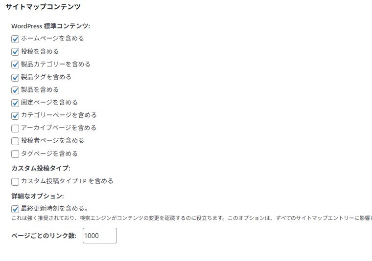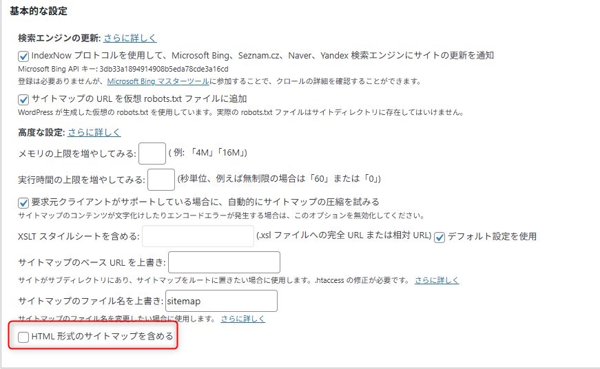 「HTML形式のサイトマップを含める」はエラーが出るためチェックを外します。
