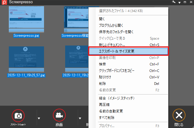 Screenpressoのワークスペース内でサイズ変更したい画像を選択し、右クリックで「まとめてサイズ変更&エクスポート」を選択すると一括でサイズ変更が可能です。
