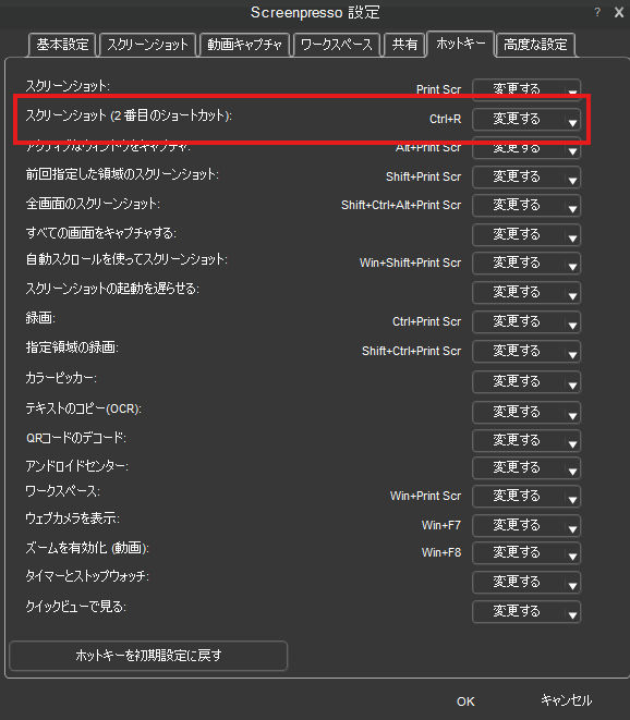 Screenpressoの設定からホットキーへいきます。そうするとショートカットキーの設定をすることができます。