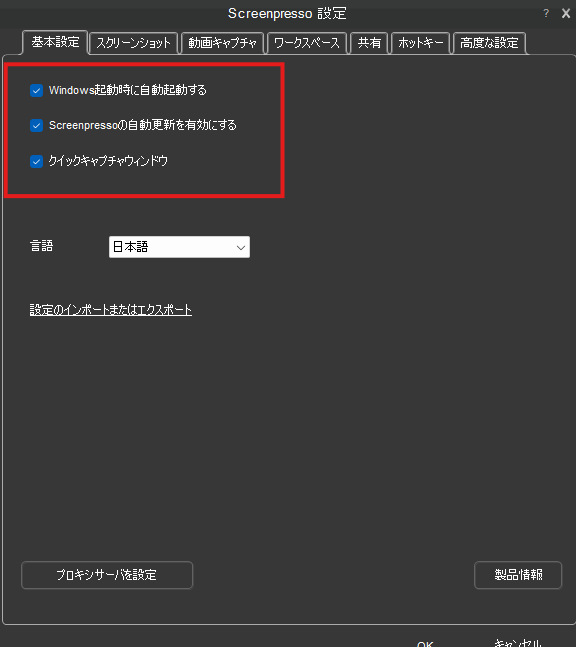 上記にもあるようにWindows起動時にScreenpressoを自動起動する設定や自動更新の設定などです。