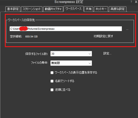 その設定項目がScreenpressoの設定のワークスペースで変更可能です。