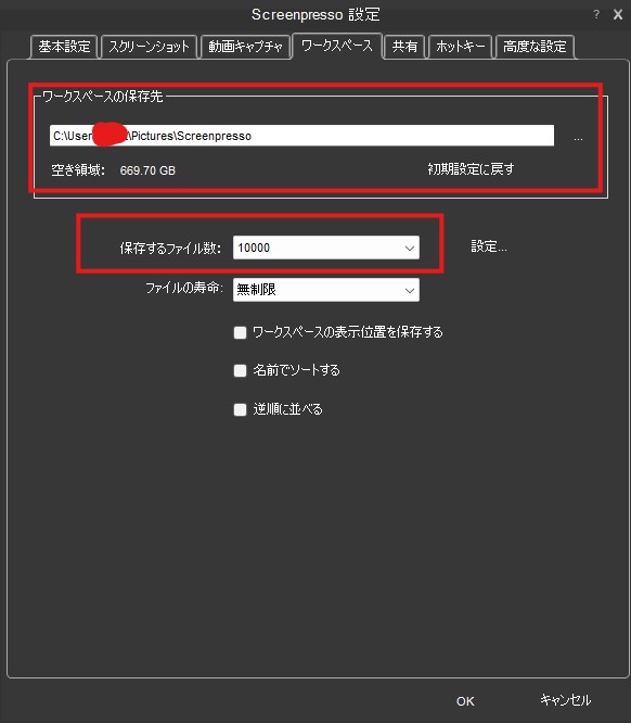 上限を超えると古いデータから削除されるため、ワークスペース内の保存する枚数は10000枚に設定するのがおすすめです。